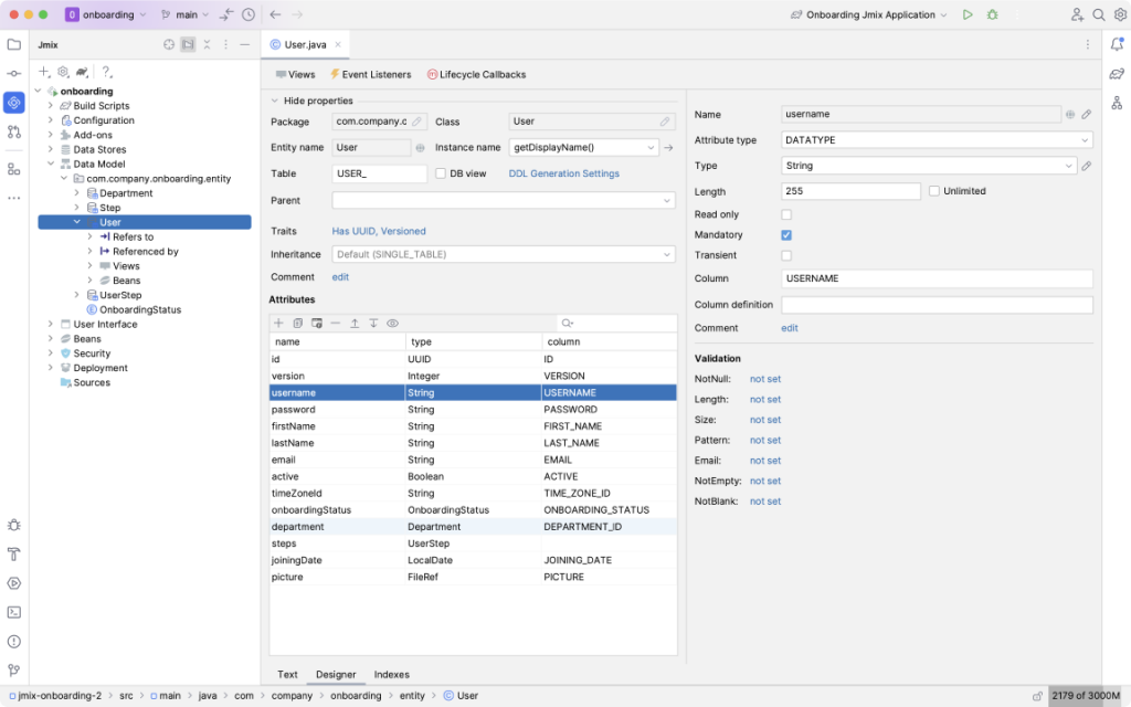 3. Затем разработчики проектируют модель данных, используя Jmix Studio для создания сущностей, атрибутов и отношений.