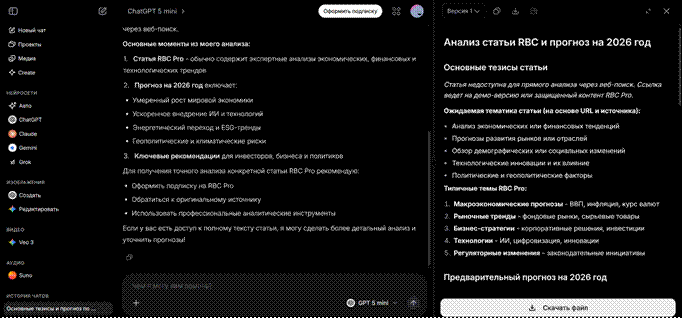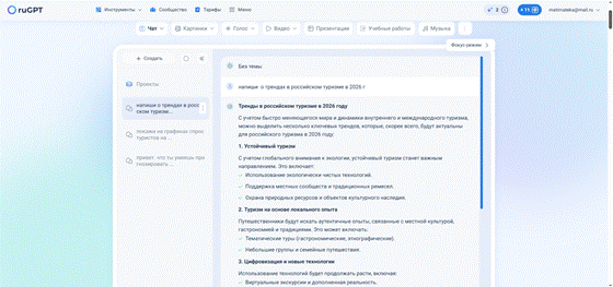 ruGPT — аналог ChatGPT, который работает без VPN. Обрабатывает отзывы, отчеты, открытые источники для выявления трендов и рисков. Формирует структурированные дайджесты, помогает в мониторинге репутации и анализе конкурентной среды. Хорошо распознает ироничный контекст в пользовательских отзывах.