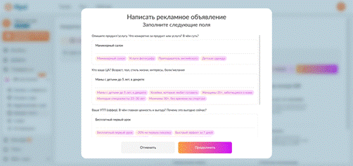 Flyvi подойдет для генерации рекламного текста и картинок для всех сфер бизнеса. Через команду «ИИ-мастерская» можно составить контент-стратегию, сформулировать оффер. Чтобы оформить успешное предложение, нужно указать, какие цели способен решить продукт, какие выгоды получает покупатель, чем компания отличается от конкурентов. Внизу каждого поля для заполнения есть тематические подсказки, например «Нет времени готовить», «Улучшает качества сна», «Гарантия возврата денег».