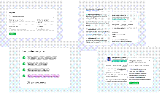 CRM-система для автоматизации подбора персонала от Сбера. Позволяет вести единую базу кандидатов, настраивать воронки найма и интегрироваться с популярными площадками — hh.ru, «Работа.ру», «Авито». Автоматизирует рутинные задачи рекрутера: сбор откликов напрямую из работных сайтов, отправку сообщений кандидатам через мессенджеры и почту, формирование отчетов по эффективности найма.