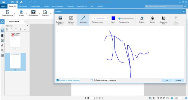Программа поддерживает добавление рукописных подписей из файла. Также можно создать роспись прямо в интерфейсе. Для этого на панели «Редактор» воспользуйтесь одноименной функцией.