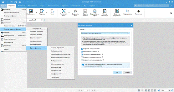 Если нужно перевести PDF в другой формат, софт поддерживает преобразование в DOCX, XLSX, TXT, JPEG, PNG, TIFF, BMP и другие типы.